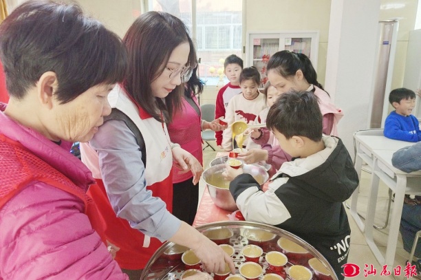 汕尾日报讯 (记者 沈绿洋) 春节前,海丰县海城镇南门社区新时代文明实践站暖意融融、香气氤氲,洁白的面粉、绵密的红糖、亮眼的模具整齐摆放,一场充满年味与烟火气的传统手艺制作活动热闹上演。志愿者们变成“手艺老师”,耐心细致地指导孩子们搅面、拌浆、倒模,每一个步骤都讲解得清清楚楚。孩子们认真专注、跃跃欲试,小手搅、拌、倒,一个个饱满、规整的发粿胚子在孩子们的巧手中慢慢完成。