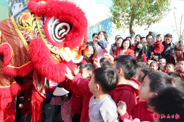 图为幼儿们与醒狮的互动现场。