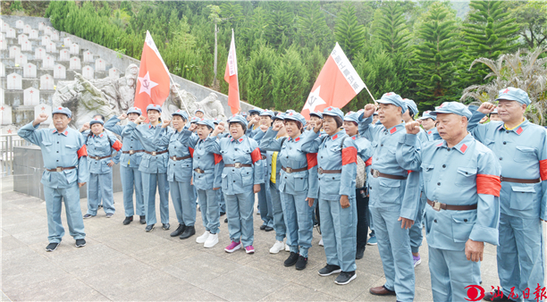 近日,陆河县老年人体育协会红歌合唱团成员到陆河县新田镇原激石溪革命根据地开展庆祝建党100周年“唱红歌、忆党史、感党恩”活动。红歌合唱团成员身穿红军装,个个精神抖擞,瞻仰了革命烈士纪念碑,重温入党誓词,聆听英雄故事,高唱红色歌曲。嘹亮的歌声传颂着党的辉煌历程和丰功伟绩,唱响了老区人民努力奋斗的豪情壮志,激发了大家爱党爱国的热情,展示了陆河中老年人的精神风貌。图为红歌合唱团成员在重温入党誓词。