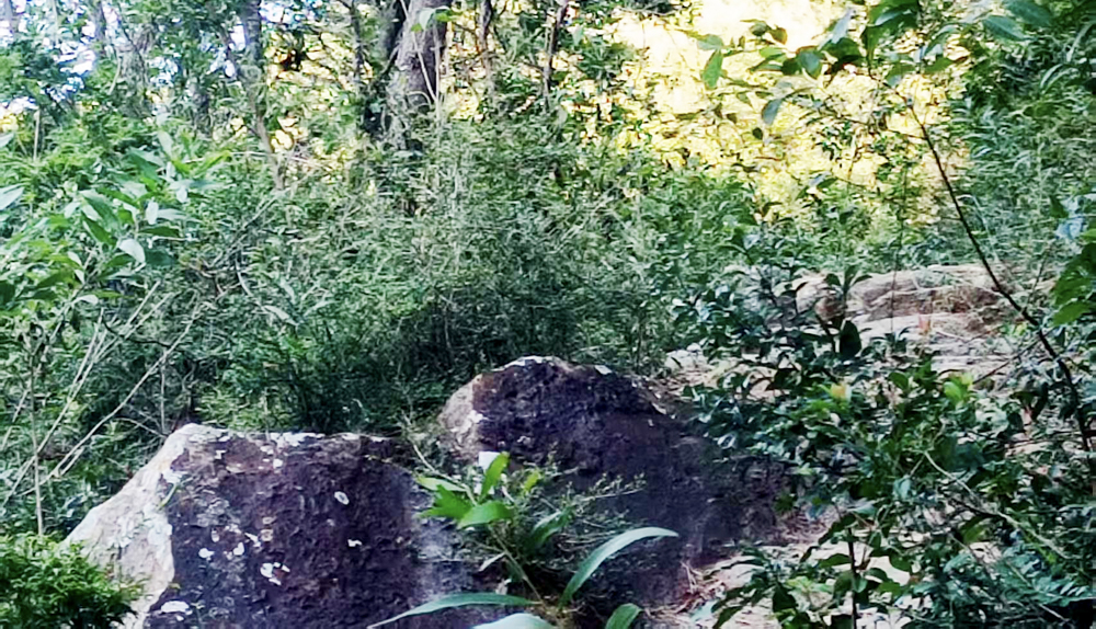 过一条铺建在峡谷上的小桥来到左侧山峰。在一路况崎岖的羊肠小道,一侧是悬崖,另一侧是峭壁,左右草本掩蔽,横柯上蔽,在昼犹昏。小路曲曲弯弯细又长,蜿蜒地伸向大山的密林深处。沿途有乱石,有杂草及带刺的藤树,同伴不时提醒要小心,防止滑跌,还轻哼起苏联歌曲《小路》:“一条小路曲曲弯弯细又长,一直通往迷雾的远方。 我要沿着这条细长的小路,跟着我的爱人上战场……”歌声让我想起黄强、彭铿、蓝训材等领导工农红军及赤卫队在这片崇山峻岭上开展游击战争的革命故事,仿佛遁入光阴的隧道,眼前浮现出电影中红军战士在深山密林行军作战的画面……